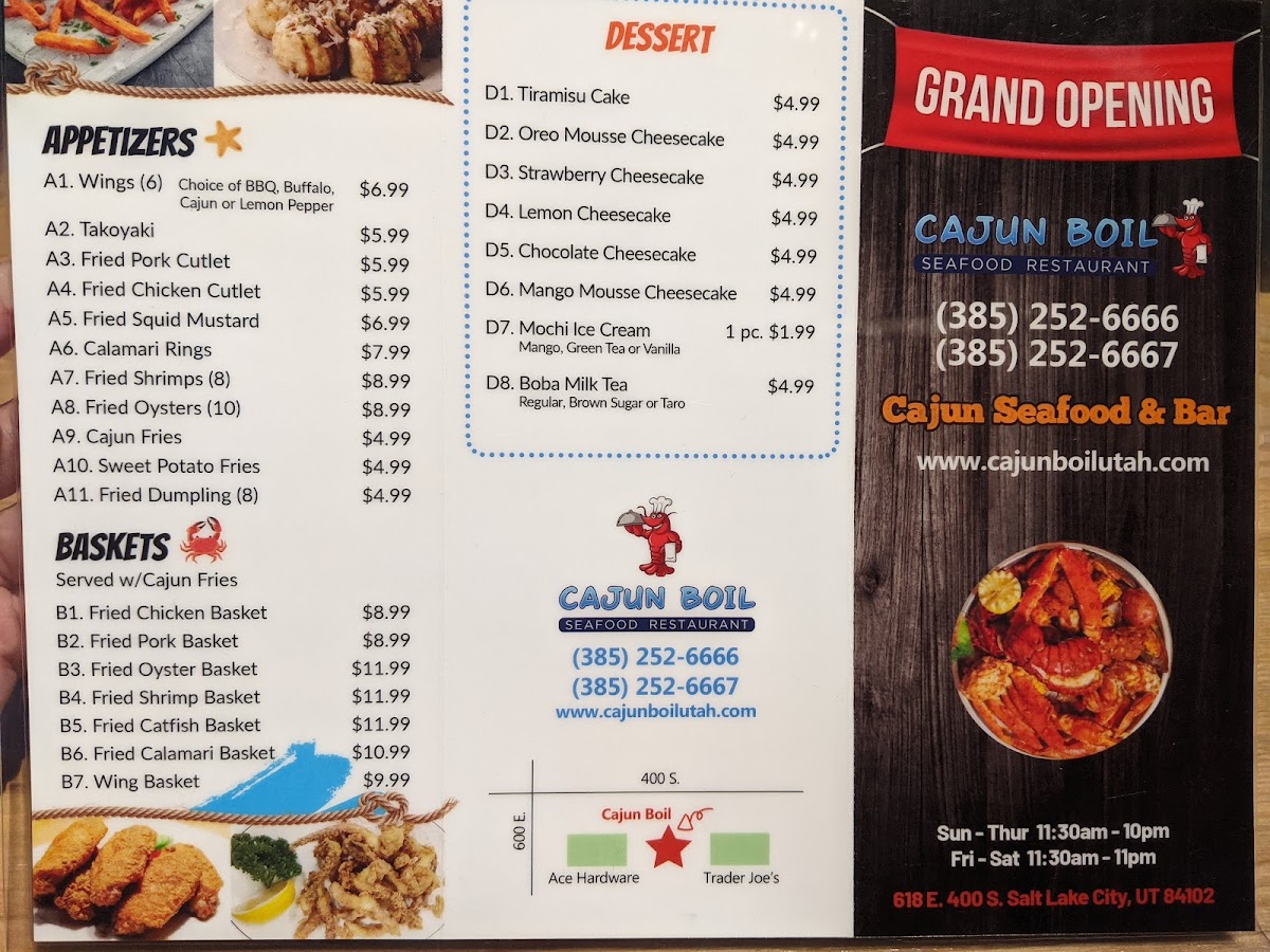Welcome to Cajun Boil Seafood, an emerging gem located at 618 E 400 S, Salt Lake City, UT 84102. This vibrant seafood spot offers a culinary experience that promises to transport your taste buds right to the heart of Cajun country. Whether you're a seafood aficionado or just someone seeking a delightful meal, Cajun Boil Seafood shines with its fantastic array of offerings and a warm, inviting atmosphere.