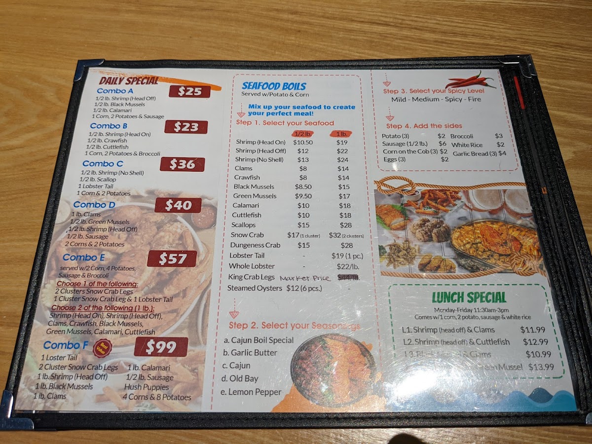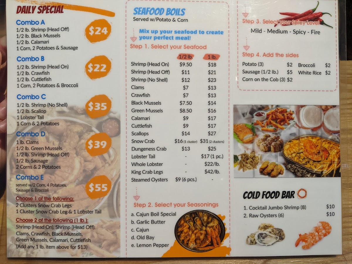 - Daily Specials: The Combo E includes 2 corn, 4 potatoes, sausage, and broccoli at $77.75.